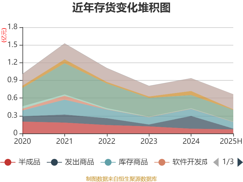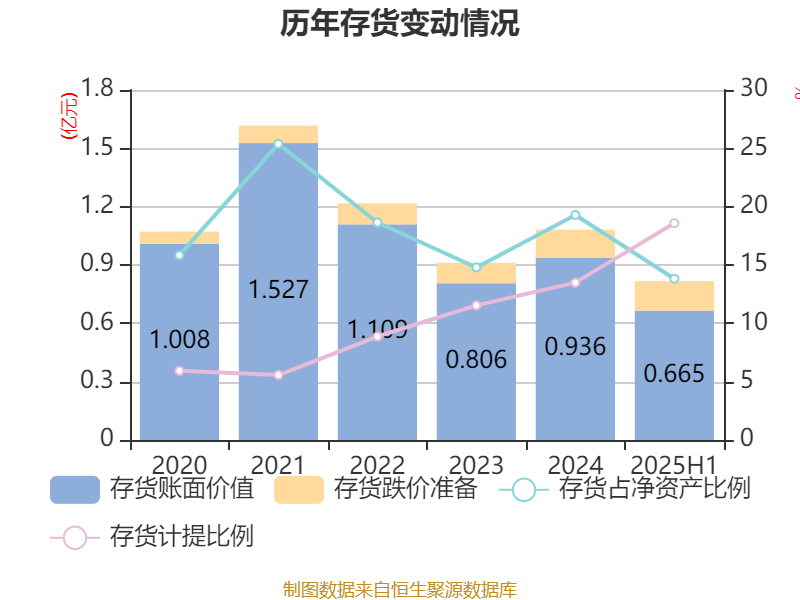 从存货变动来看,截至2025年上半年末,公司存货账面价值为6646.89万元,占净资产的13.82%,较上年末减少2712.07万元。其中,存货跌价准备为1517.8万元,计提比例为18.59%。