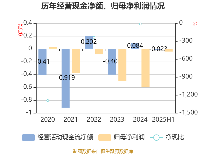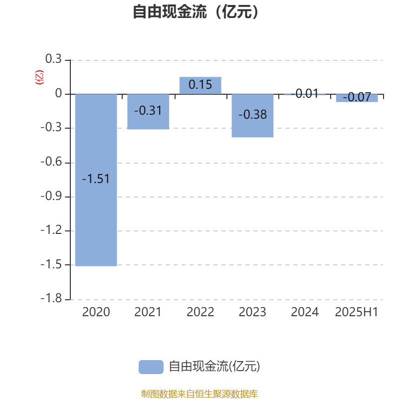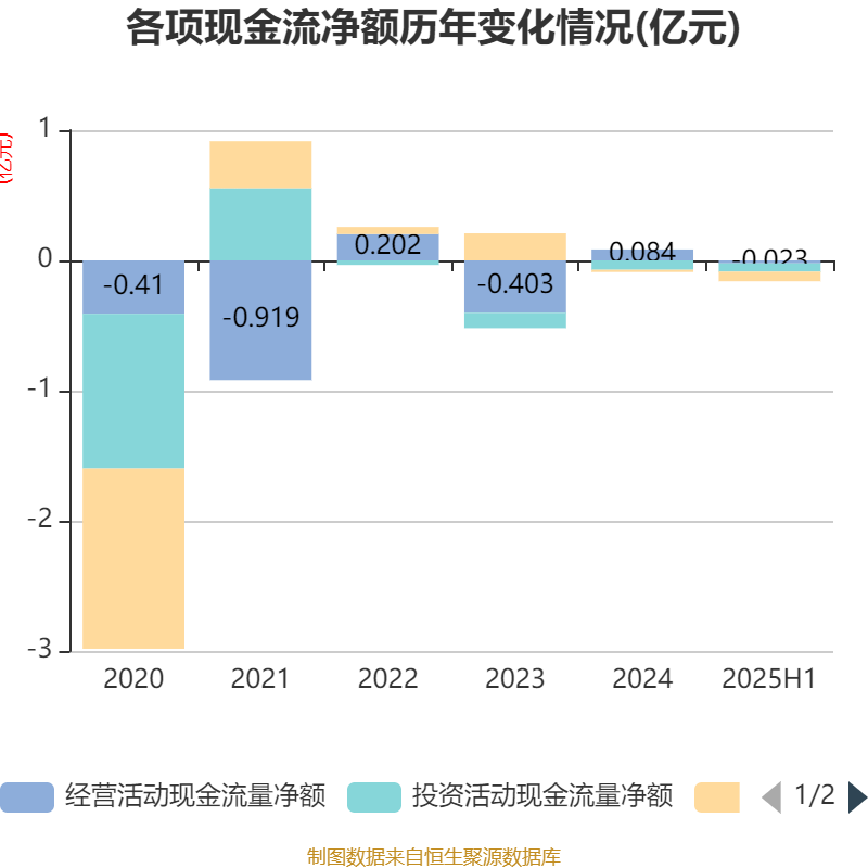 2025年上半年,公司经营活动现金流净额为-228.29万元,同比增加986.87万元;筹资活动现金流净额-741.95万元,同比减少1094.91万元;投资活动现金流净额-629.32万元,上年同期为-399.74万元。