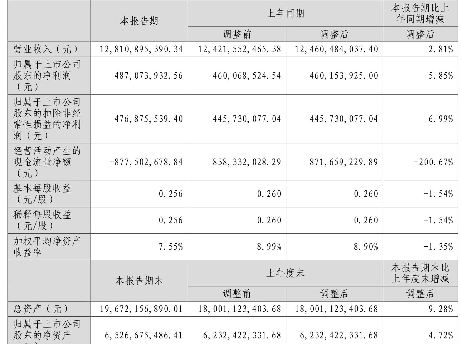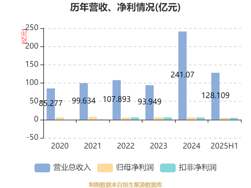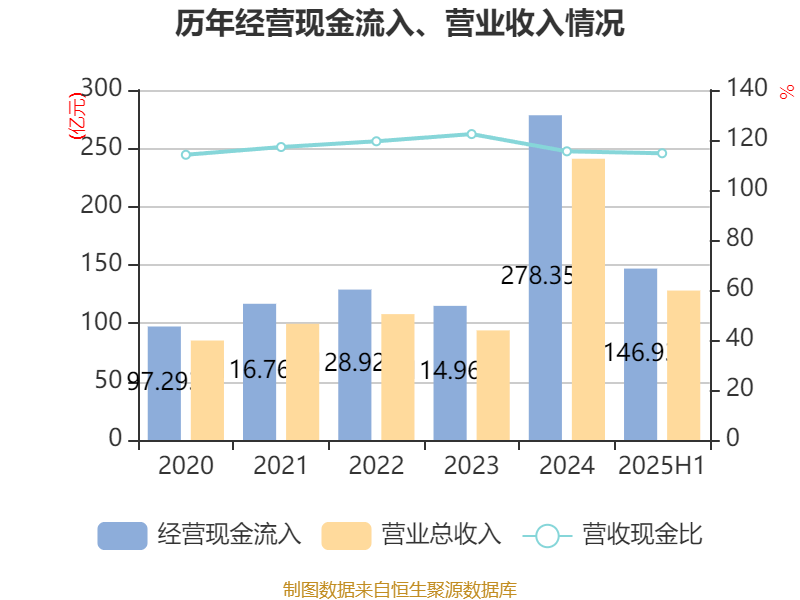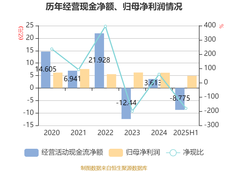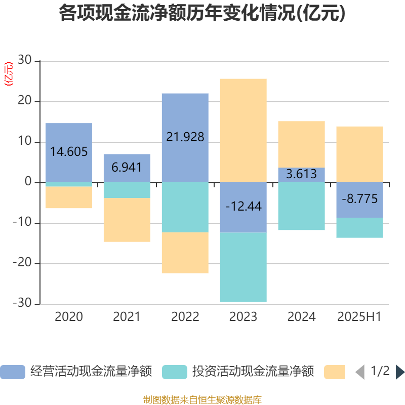 2025年上半年,公司经营活动现金流净额为-8.78亿元,同比减少17.49亿元;筹资活动现金流净额13.77亿元,同比增加13.67亿元;投资活动现金流净额-4.93亿元,上年同期为-7.39亿元。