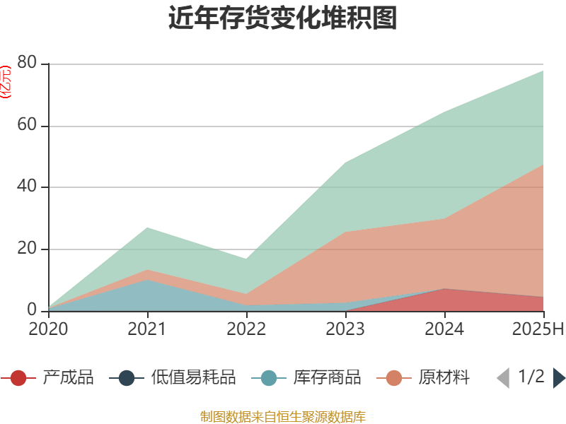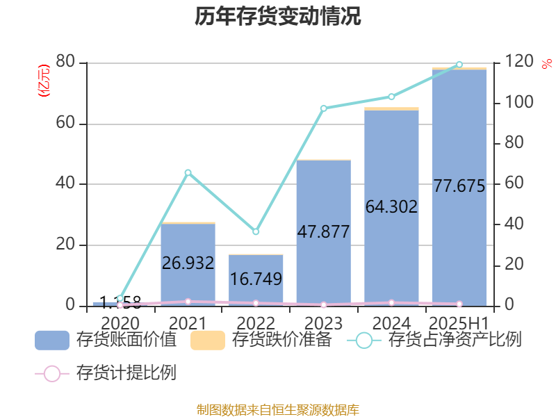 从存货变动来看,截至2025年上半年末,公司存货账面价值为77.68亿元,占净资产的119.01%,较上年末增加13.37亿元。其中,存货跌价准备为7215.4万元,计提比例为0.92%。