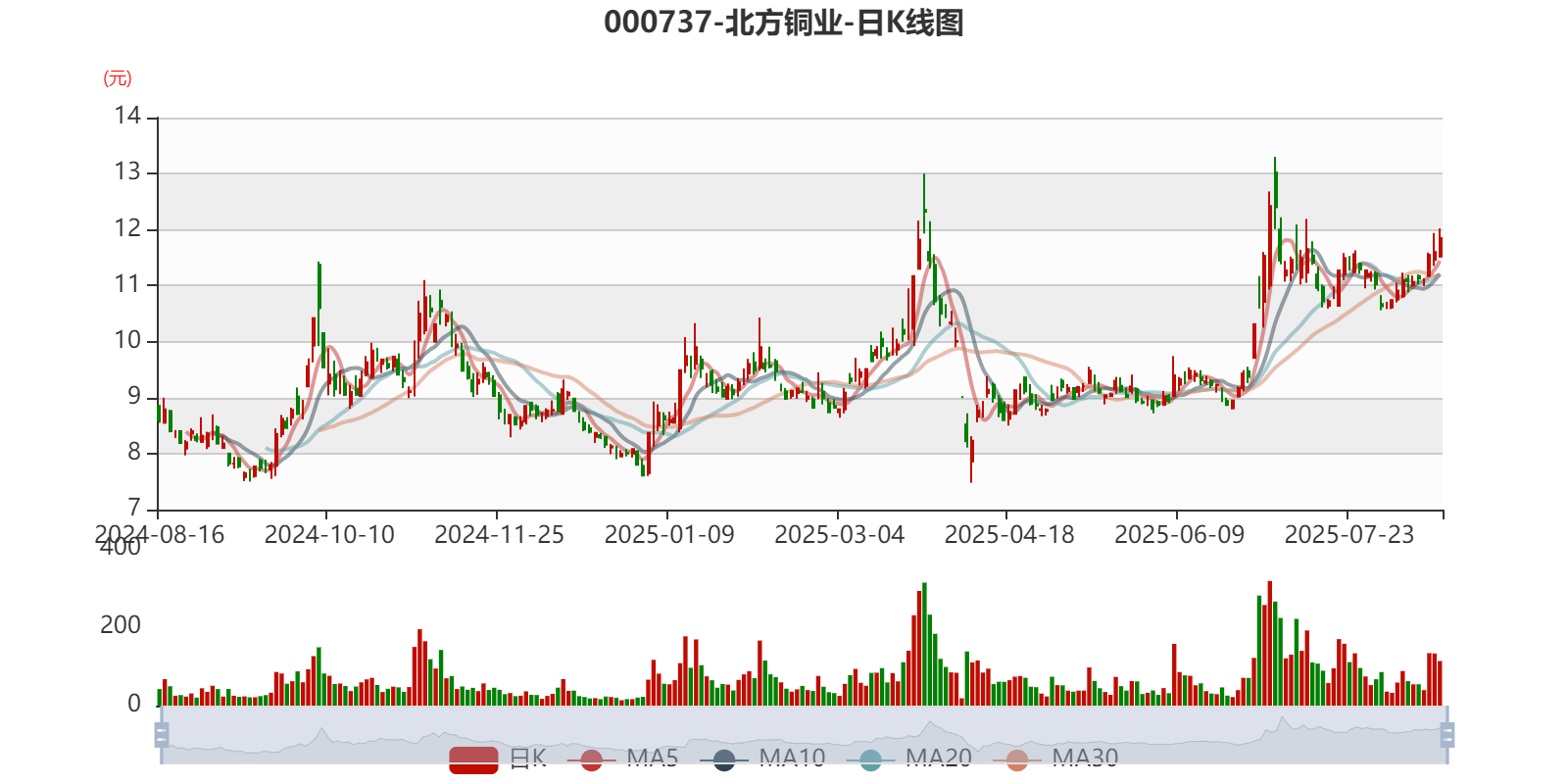中证智能财讯北方铜业(000737)8月16日披露2025年半年度报告。2025年上半年,公司实现营业总收入128.11亿元,同比增长2.81%;归母净利润4.87亿元,同比增长5.85%;扣非净利润4.77亿元,同比增长6.99%;经营活动产生的现金流量净额为-8.78亿元,上年同期为8.72亿元;报告期内,北方铜业基本每股收益为0.256元,加权平均净资产收益率为7.55%。