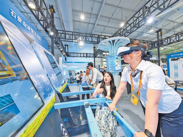 图为观众体验通过VR模拟设备进行滑雪。北京日报记者 吴镝 摄